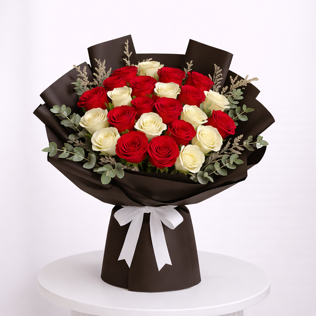 A classy and elegant medium-size bouquet designed with a beautiful contrast of red and white roses, accented with soft limonium for extra texture and charm.