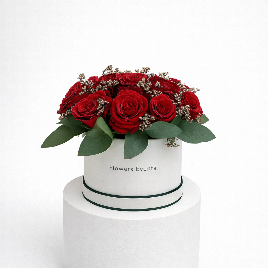 A timeless and elegant arrangement featuring 22 premium red roses, beautifully styled in a classic round box. Accented with fresh eucalyptus and soft limonium, this design delivers a rich, romantic, and luxurious feel—perfect for anniversaries, special occasions, or expressing deep affection with sophistication.