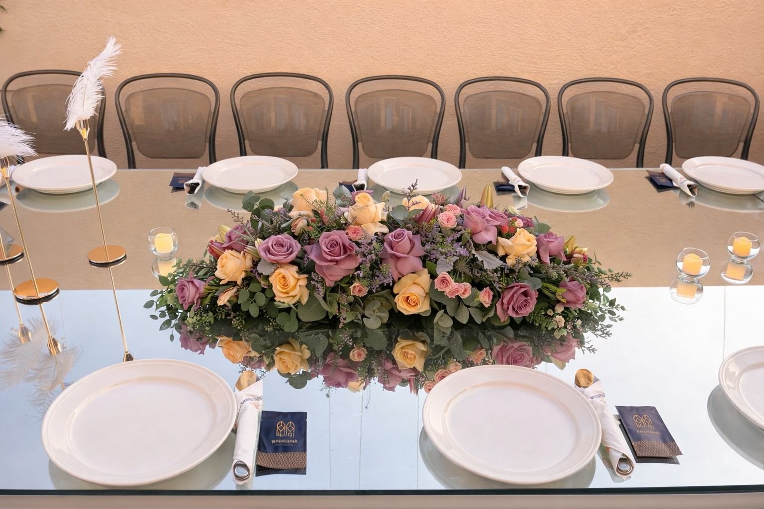 An elegant floral centerpiece designed in soft blush and ivory tones with fresh greenery accents, creating a romantic and refined table setting. Its compact, low-profile design enhances table beauty without blocking views, making it perfect for engagement parties and intimate celebrations in Dubai.