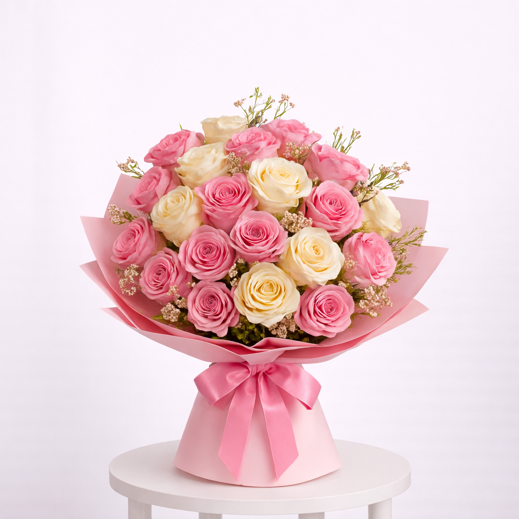 A luxurious, soft pink bouquet beautifully arranged with delicate shades of pink and creamy white roses, finished with touches of wax flowers for a natural, elegant look.