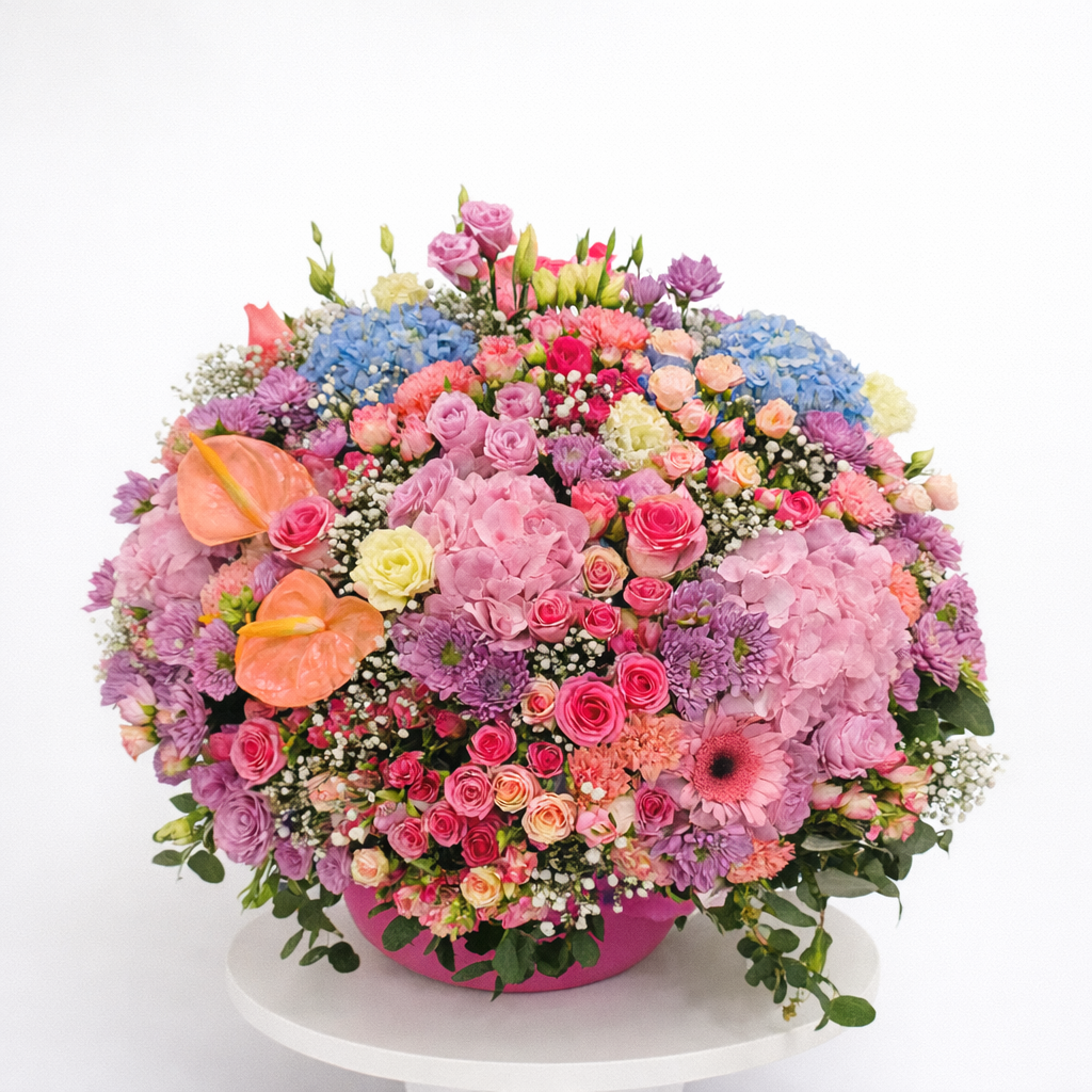 Designed with layers of soft pastels and premium blooms, this grand piece showcases exceptional craftsmanship and an opulent, full-rounded shape that radiates elegance from every angle.