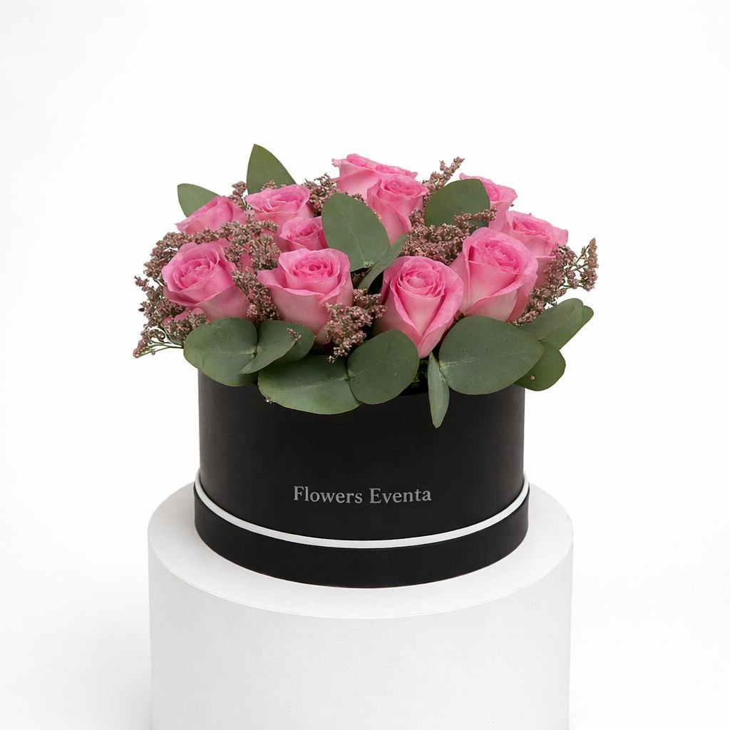 A chic and elegant rose arrangement featuring 22 vibrant pink roses, beautifully styled in a sleek black box. Accented with eucalyptus and soft limonium for a fresh, balanced, and luxurious look. Perfect for birthdays, thank-you gifts, celebrations, or adding a touch of refined beauty to any space.