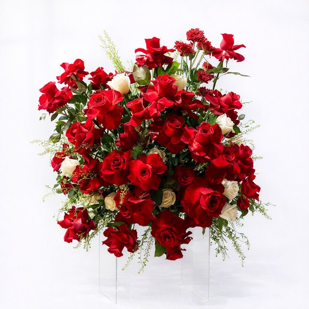 A very large luxury stand arrangement crafted with premium red roses and elegant greenery for a bold, romantic statement.