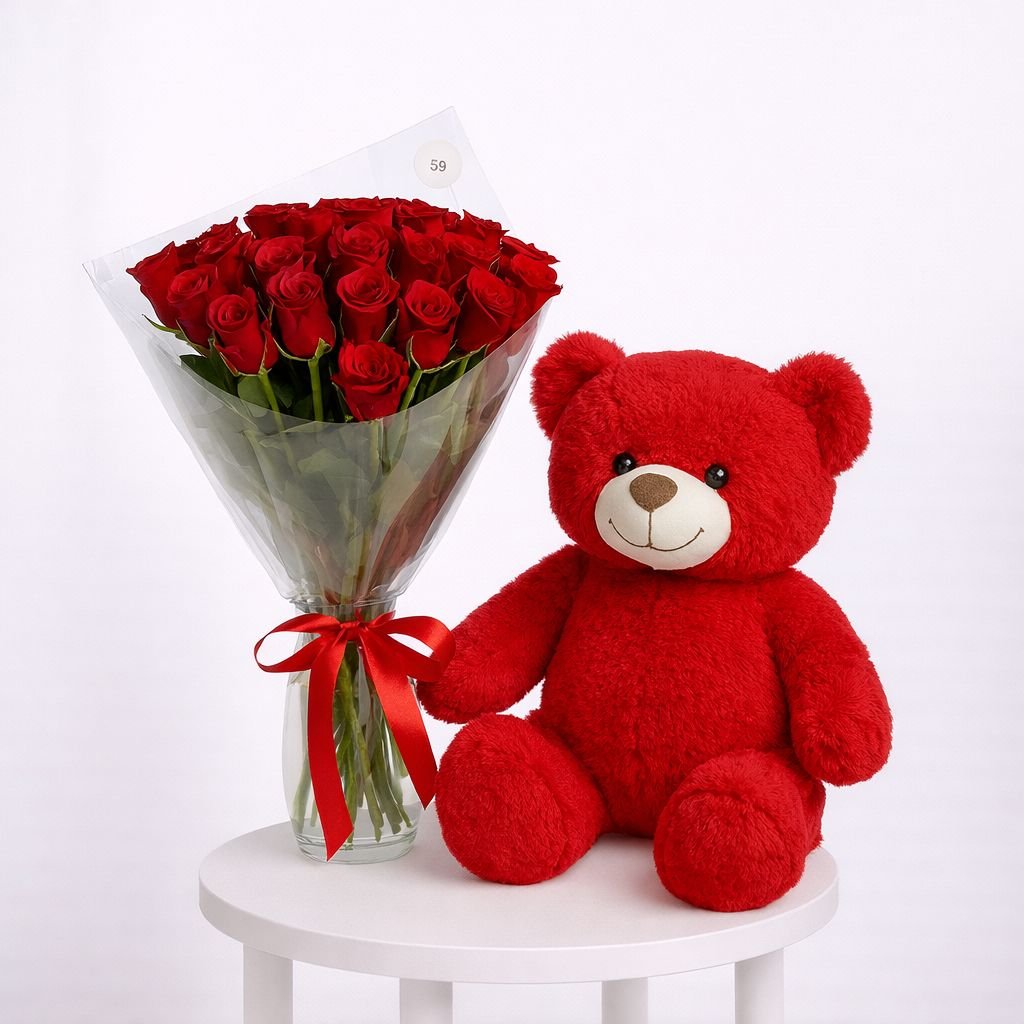 Express your deepest feelings with this stunning Valentine’s gift set featuring 40 premium red roses symbolizing love and passion, paired with a soft red teddy bear that adds a warm and romantic touch.