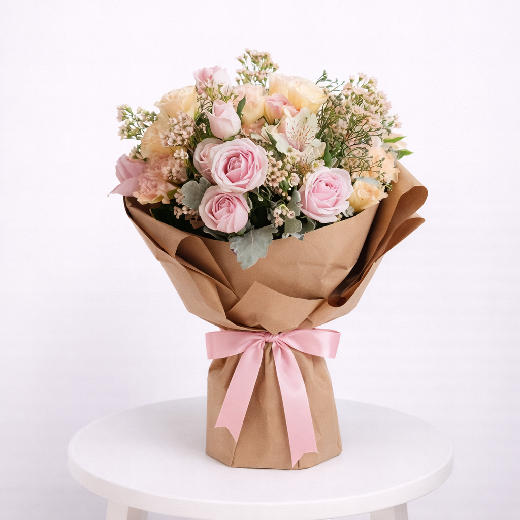 Crafted with a romantic blend of pink and pastel tones, this bouquet brings warmth, delicacy, and timeless elegance — all in a perfectly balanced medium size.