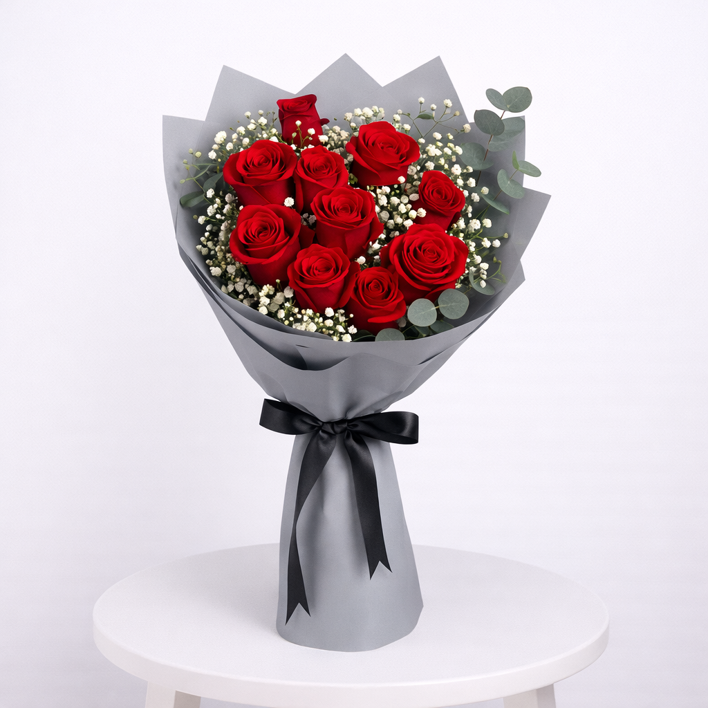 A stunning and romantic bouquet designed with 15 premium red roses, beautifully surrounded by 3 stems of gypsophila for a soft, dreamy finish.