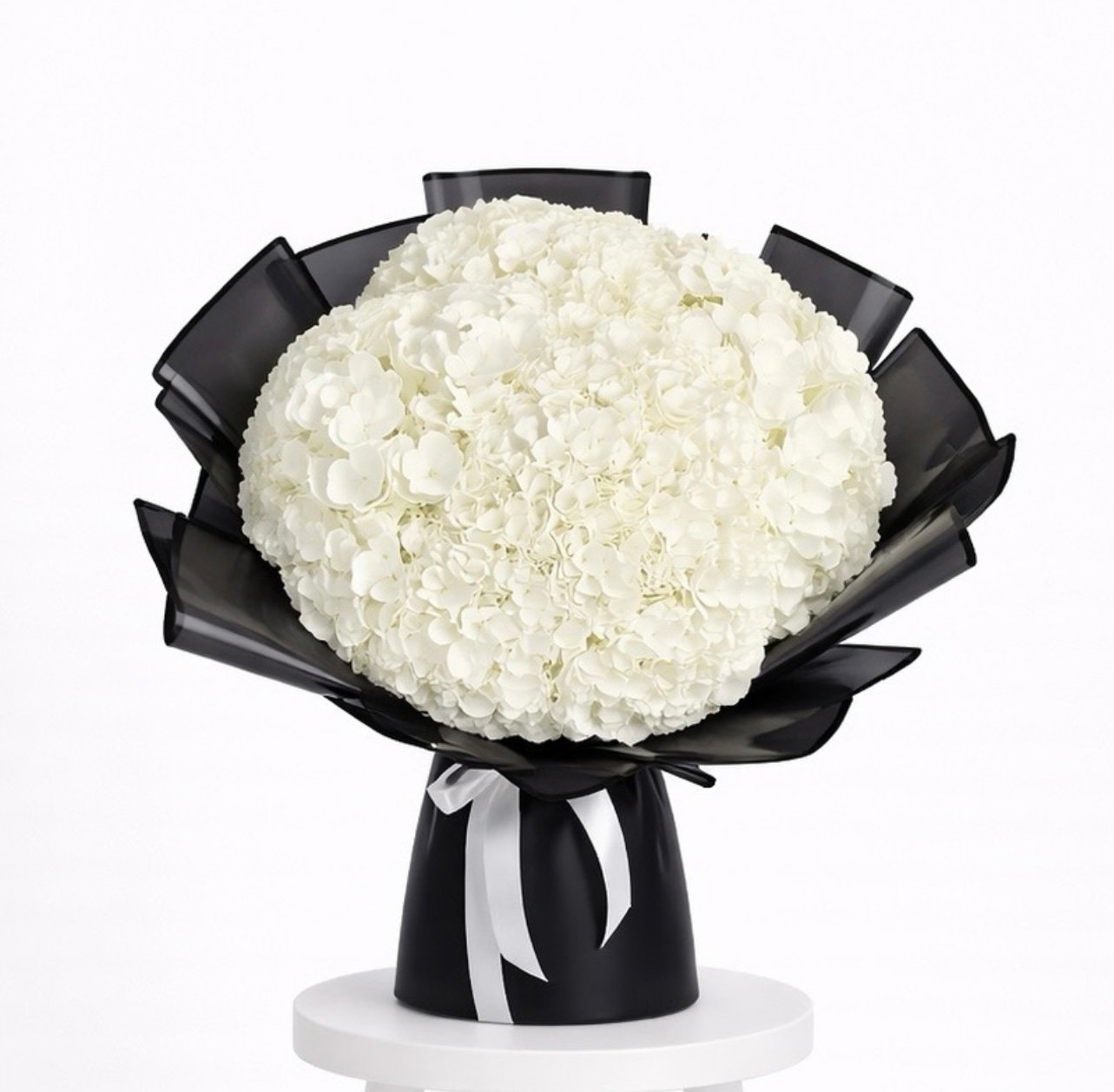 A luxurious and voluminous bouquet featuring 12 premium white hydrangea stems, arranged to create a full, cloud-like shape with soft, elegant texture.