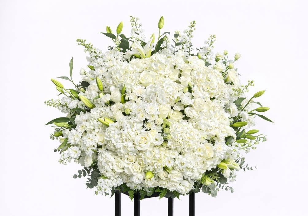 A large luxury white flower stand arrangement designed with premium blooms for a clean, elegant, and timeless look.